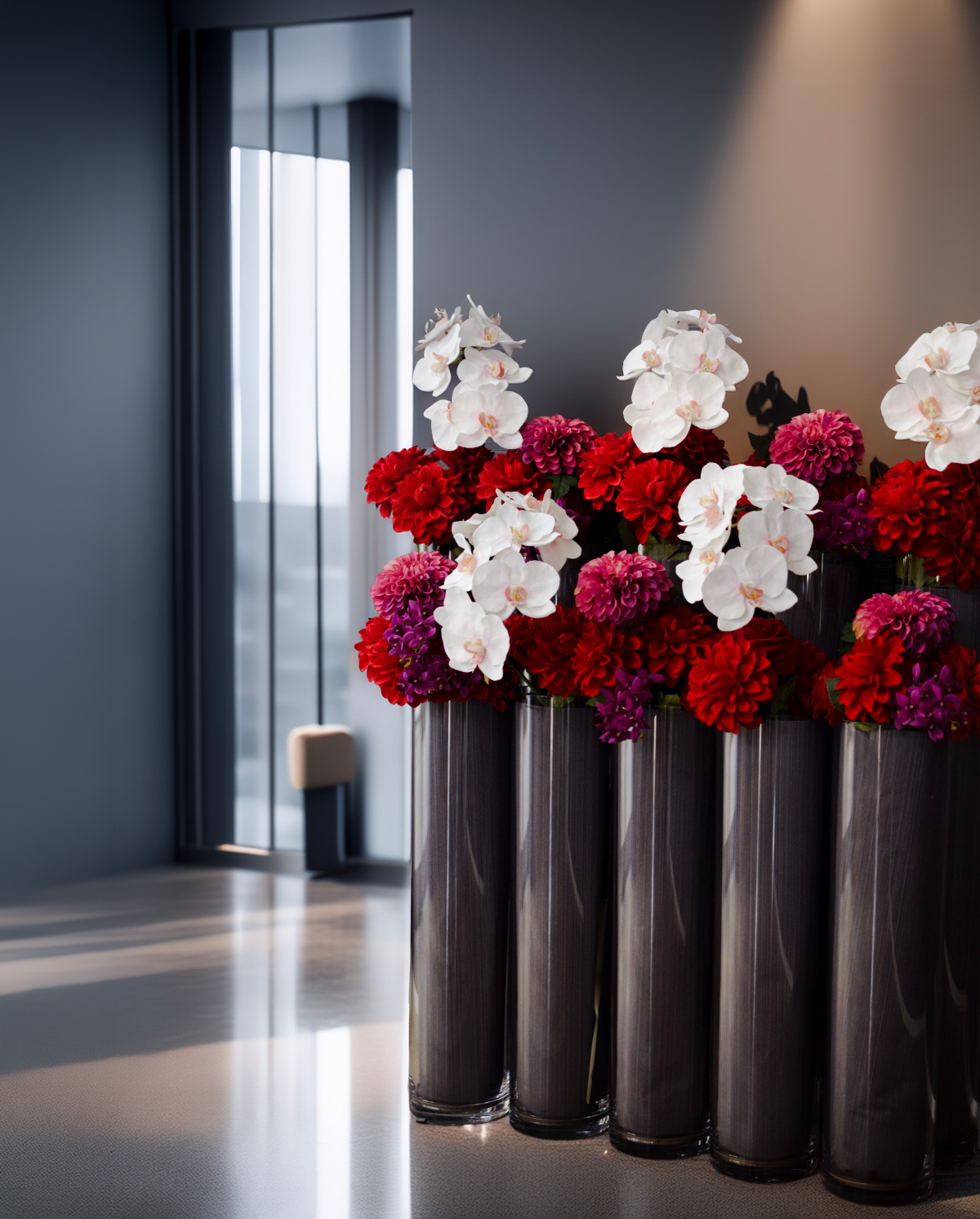 生花(フレッシュフラワー)と高品質造花(アーティフィシャルフラワー)とを、目的や場所、期間に応じて巧みに使い、ブランド価値を支えます。